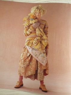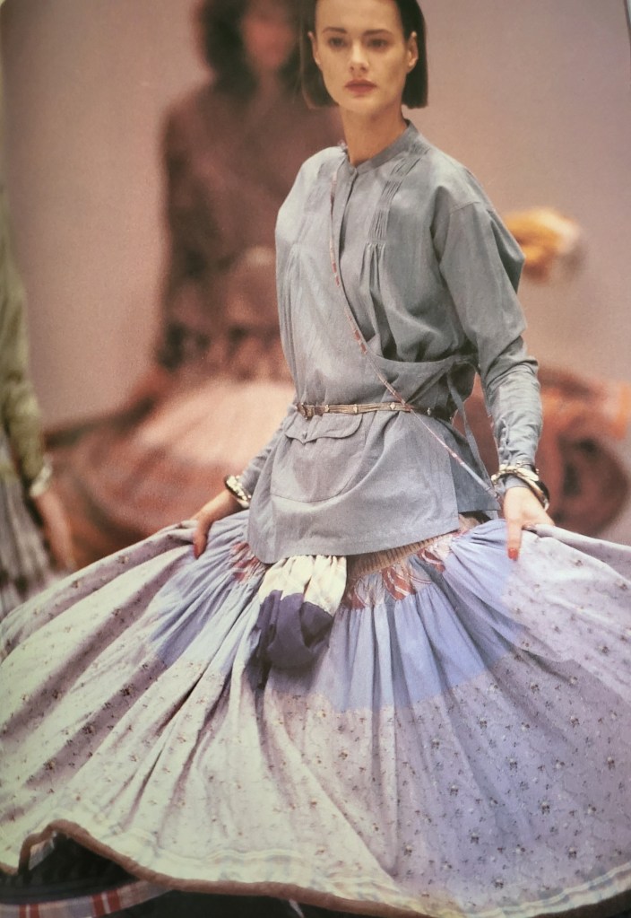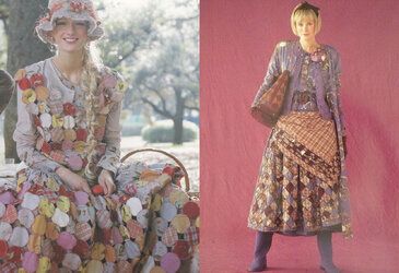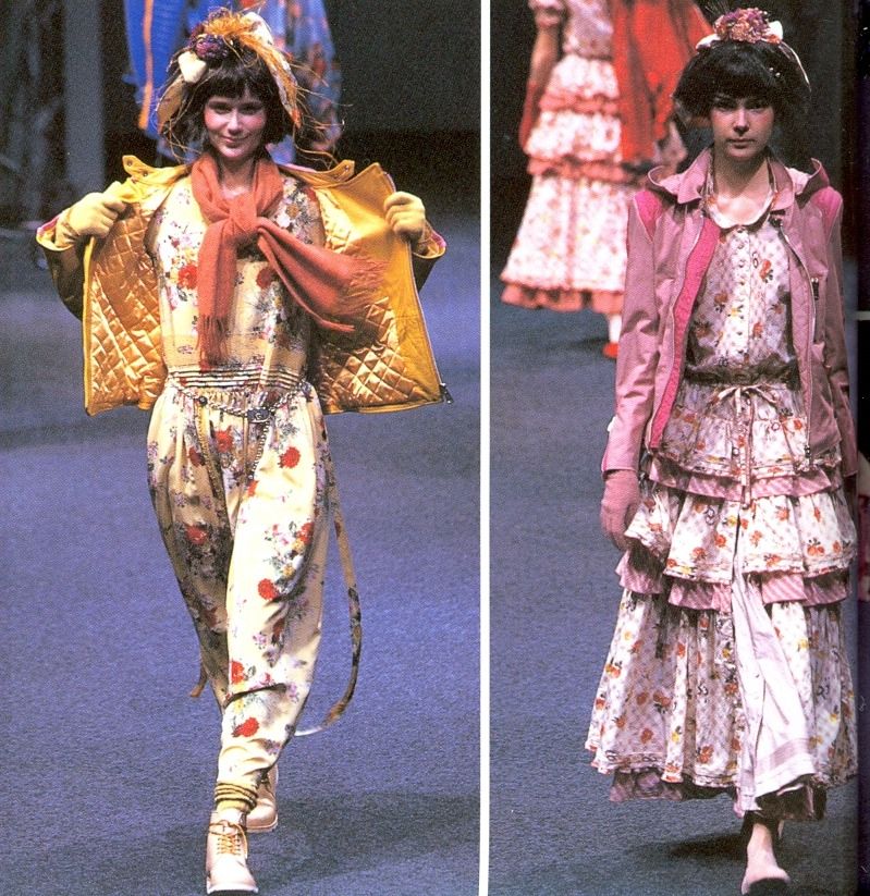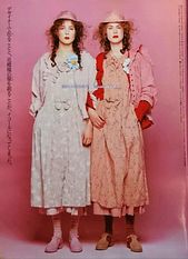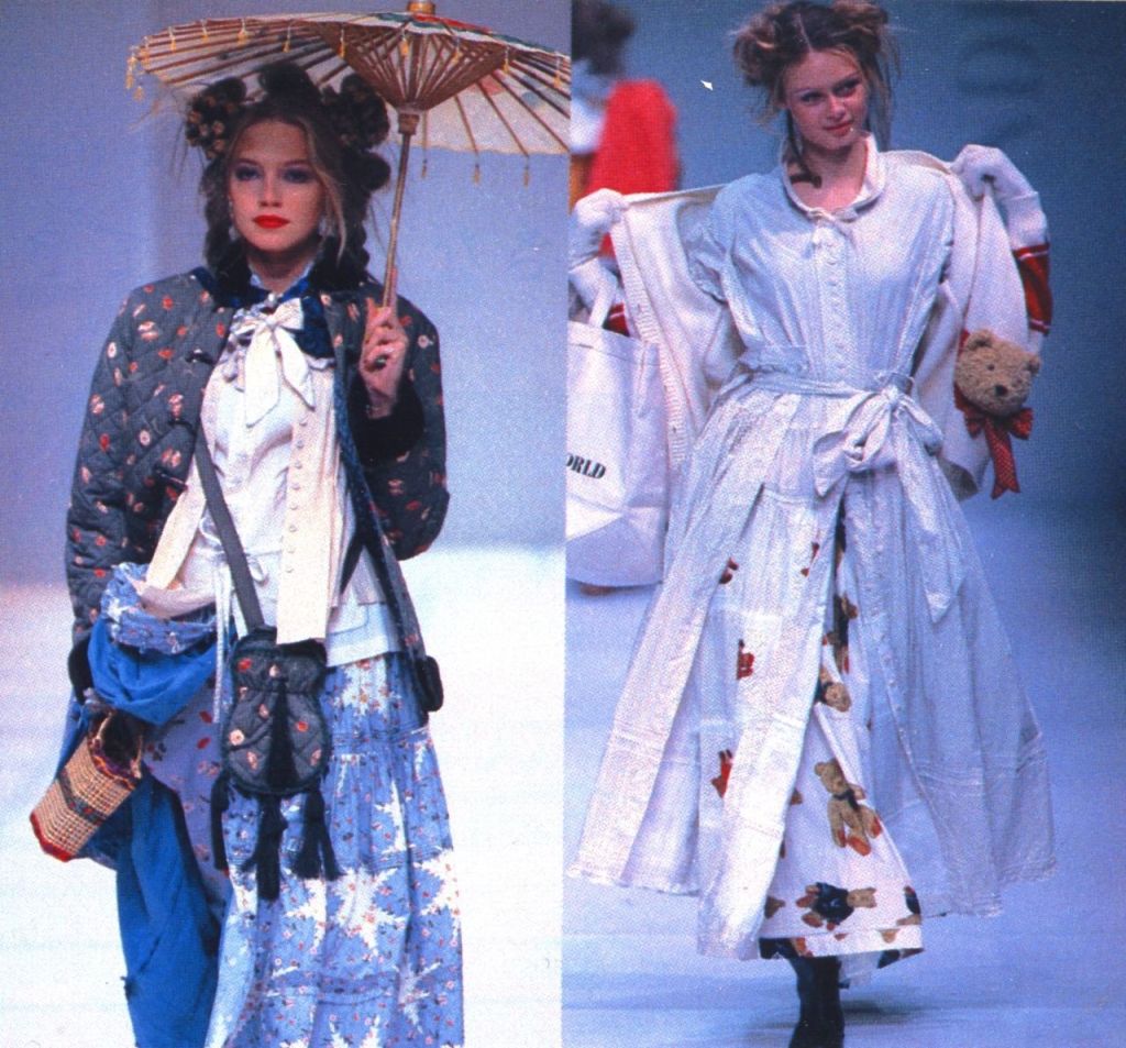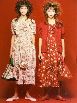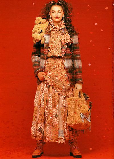 Later, when I looked up Isao Kaneko, or Kaneko Isao, very little came up at first. But with a little digging, I was able to find snippets of information. It seems he started designing clothing in the 1970s inspired by the prairie styles popular in the US at the time. Think Gunne Sax. I could not find out how long he designed runway collections under his own name as he had for the collection in the book. In 1982, he was one of the founding designers of the Japanese brand, Pink House, which still exists, though he is no longer affiliated. The brand and Isao’s design style is so particular that they became almost a genre of style similar to Japanese Kei. Kei essentially means type and is often used following a style descriptor. To some, it became known as Natural Kei but seems to be more commonly known in Japan as Pink House style or Kaneko style. The style is characterized by heavy layering, especially on the bottom of multiple skirts or bloomers and skirts. The styling often includes even more layers with scarves tied around the waist like an apron. Cozy colorful knits and blazers get piled over boldly printed dresses. 3-D elements like pom poms, corsages, and literal stuffed bears add dimension to outfits. Elements of nature present in florals and deep, rich colors. While there are certainly nods of prairie styling in ruffles, lace, quilt patterns, and statement collars, the designs also pay homage to traditional Japanese as well as Chinese dress in Kimono-esque layers, quilted hanten style jackets, parasols, and frog closures.