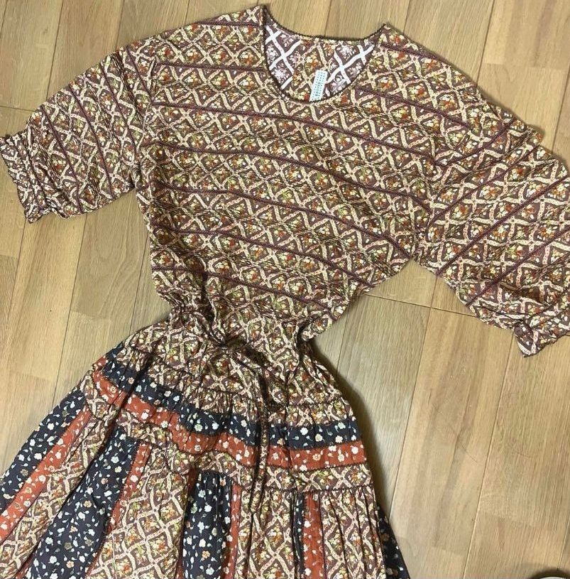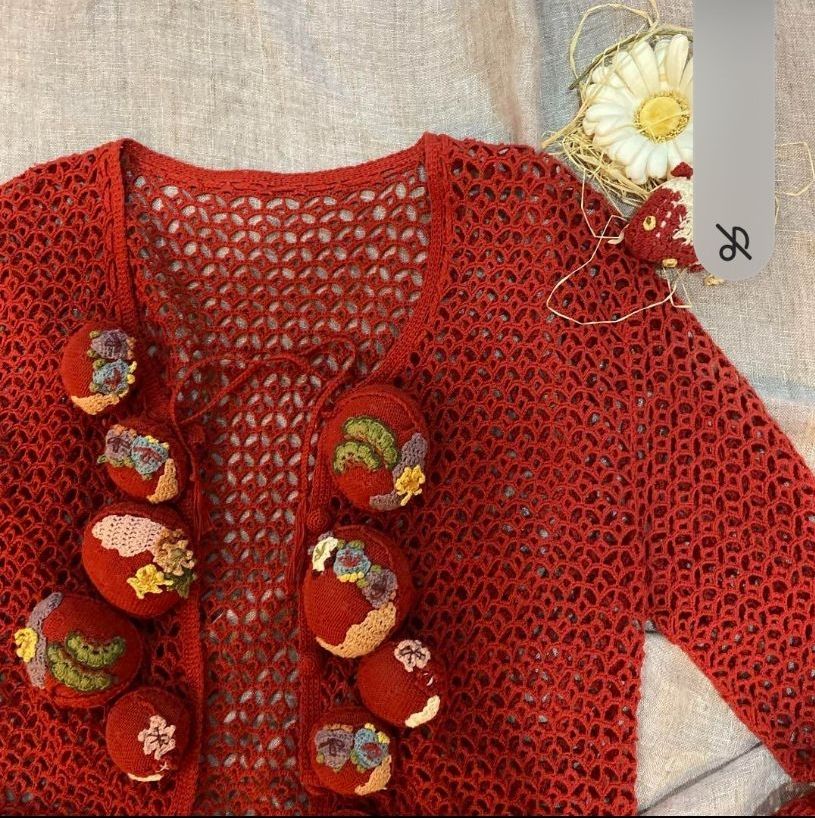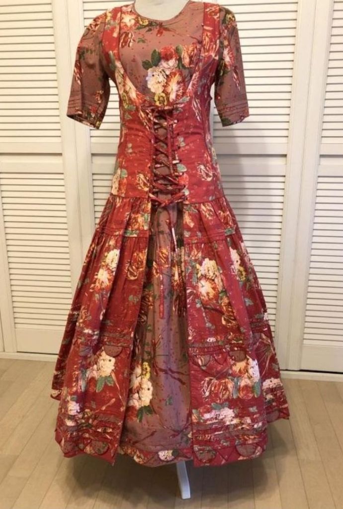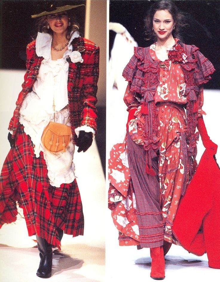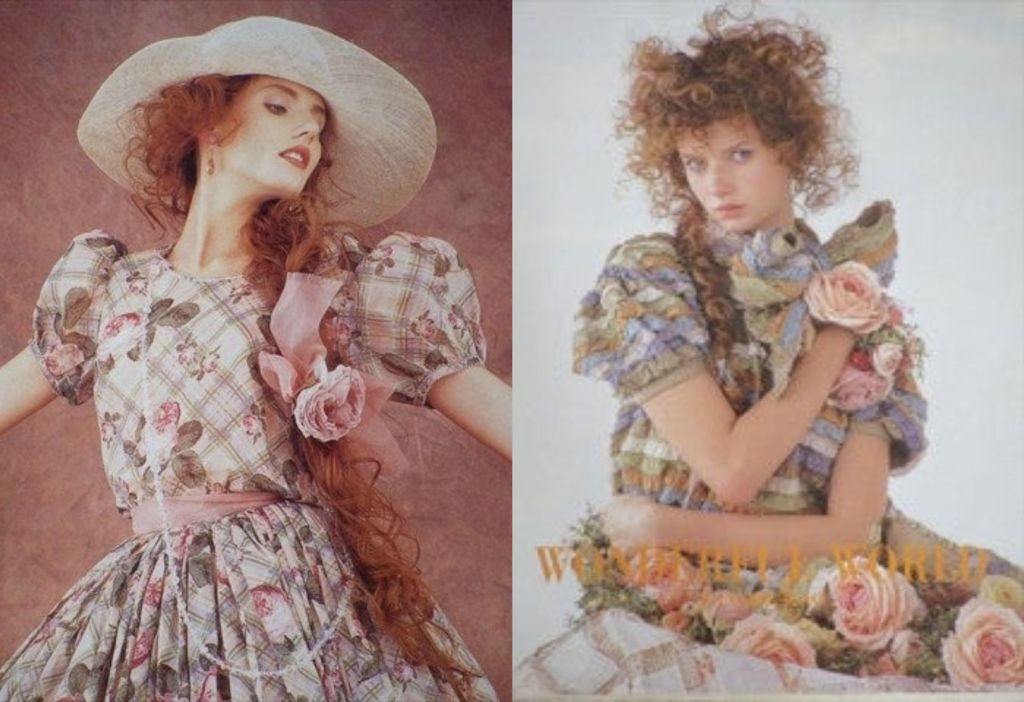 Later, when I looked up Isao Kaneko, or Kaneko Isao, very little came up at first. But with a little digging, I was able to find snippets of information. It seems he started designing clothing in the 1970s inspired by the prairie styles popular in the US at the time. Think Gunne Sax. I could not find out how long he designed runway collections under his own name as he had for the collection in the book. In 1982, he was one of the founding designers of the Japanese brand, Pink House, which still exists, though he is no longer affiliated. The brand and Isao’s design style is so particular that they became almost a genre of style similar to Japanese Kei. Kei essentially means type and is often used following a style descriptor. To some, it became known as Natural Kei but seems to be more commonly known in Japan as Pink House style or Kaneko style. The style is characterized by heavy layering, especially on the bottom of multiple skirts or bloomers and skirts. The styling often includes even more layers with scarves tied around the waist like an apron. Cozy colorful knits and blazers get piled over boldly printed dresses. 3-D elements like pom poms, corsages, and literal stuffed bears add dimension to outfits. Elements of nature present in florals and deep, rich colors. While there are certainly nods of prairie styling in ruffles, lace, quilt patterns, and statement collars, the designs also pay homage to traditional Japanese as well as Chinese dress in Kimono-esque layers, quilted hanten style jackets, parasols, and frog closures.