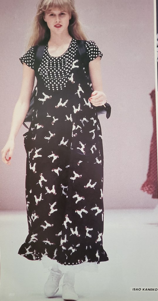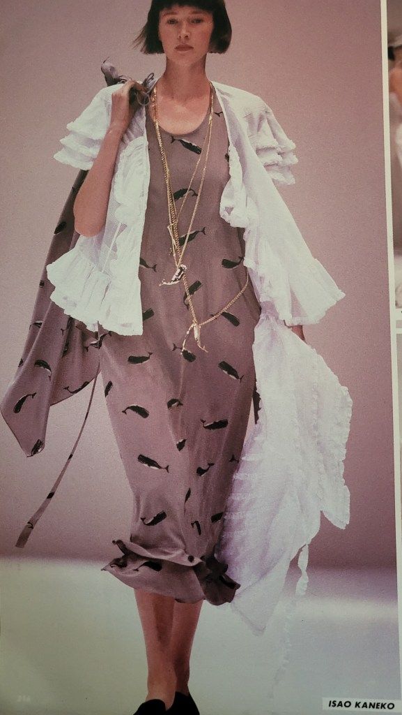 One day over the summer, I was sitting on the landing with my baby as she played on her mat. I saw on the shelf a book I had forgotten about that I had found at an estate sale called Collezioni from Spring/Summer 1987. The book shows highlights from fashion shows from the season. The book would have served as a resource for buyers to review the trends for the coming season. It has sections for each of the top fashion week cities. I was perusing through and made my way to the Tokyo section. There, I saw a handful of designs with the name Isao Kaneko. The models wore layered looks with oversized yet feminine silhouettes. Pops of novelty prints (one of my favorite things) included whales, dogs, and a wonderful anchor on a knit. I noted florals, big collars, ruffles, and jumper dresses. Really, everything I love. This collection got totally lodged in my brain.
